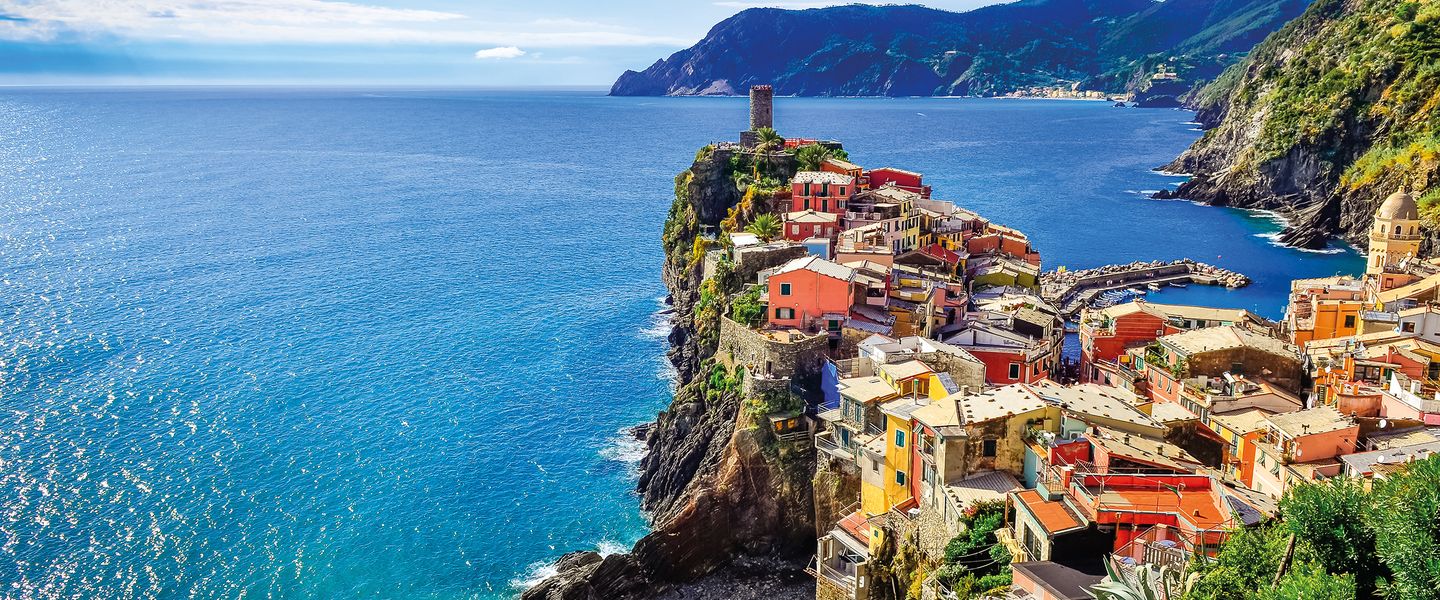 Die unberührte Landschaft der Cinque Terre ist von seltener Schönheit. Fünf malerische, verträumte Dörfer an der ligurischen Küste, farbige Häuser an steilen Hängen, kleinen Plätzen mit bunten Booten, Treppenwege und Torbögen - eine der eindrucksvollsten Landstriche der Welt.